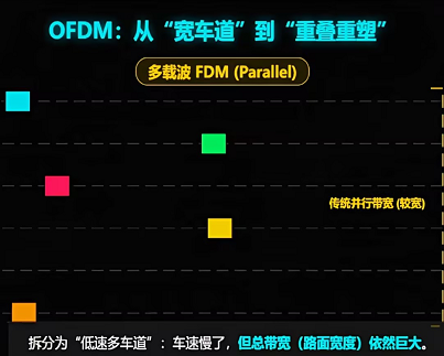 从4G到5G,从家庭WiFi到物联网,OFDM技术无处不在。它将高速数据的“单车道飙车”变成了低速多车道的“协同运输”,用正交的数学魔法节省了稀缺的频谱资源。